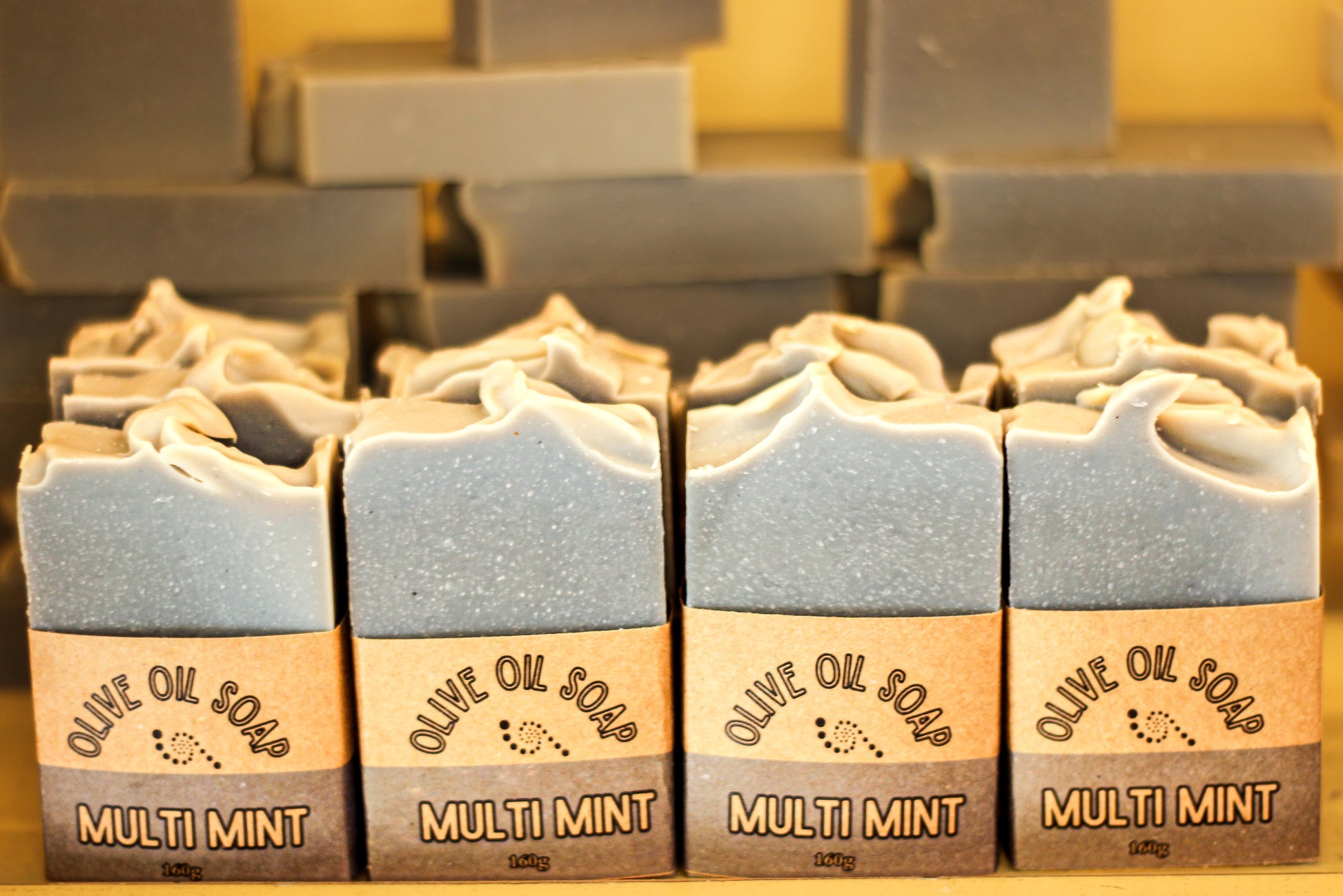 Ingredients: Olive oil, Coconut oil, water, caustic soda*, Shea butter, Castor oil, Serbian blue clay, pure essential oil blend (Spearmint & Peppermint), indigo powder.